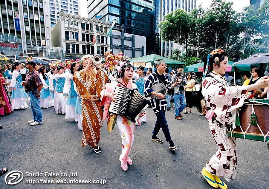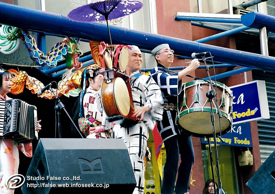 ストリートを練り歩いた後、そのままステージにあがって、ここから20分のショーのはじまりです。日本でいつも5時間、6時間と仕事をしている彼らにしてみれば、20分などあっという間。それだけに気を抜けないかも知れません。観客は白人、アジア人、いろいろな人種のゴッタ煮です。