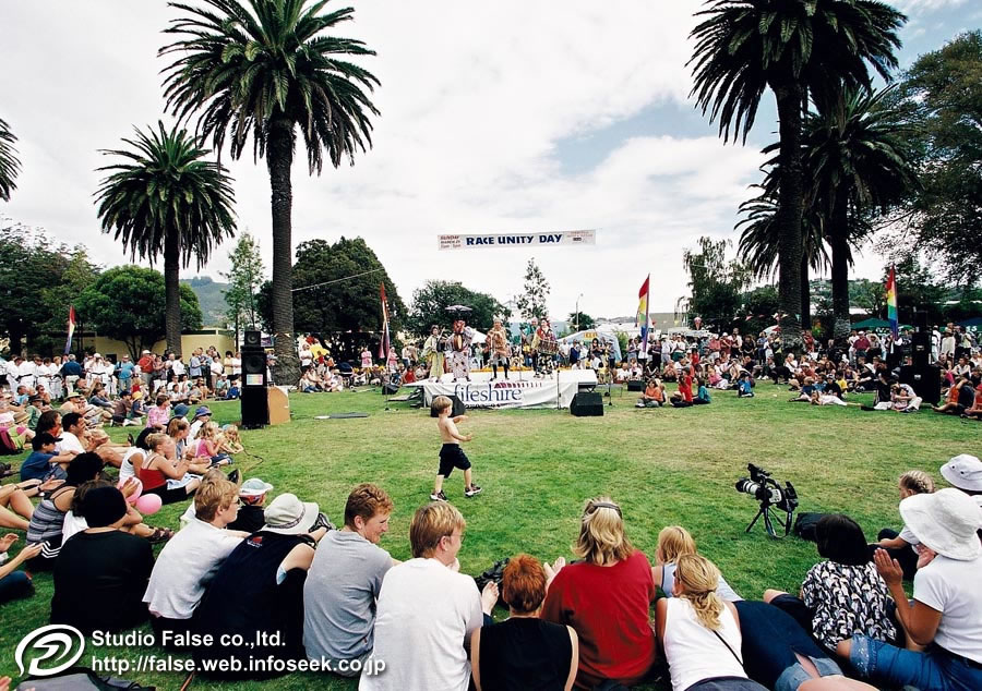 このネルソンでの滞在は、予定では1日限り。昨夜の便で到着したわけですから、今夜にはもう次の目的地へ移動しなければなりません。ただし出演仕事は、このアイザック・パークでのパフォーマンス、午前1回、午後1回だけですから、余裕があるといえば余裕のある日程です。昼食をすませ、午後からのステージにそなえるチンドン一行。