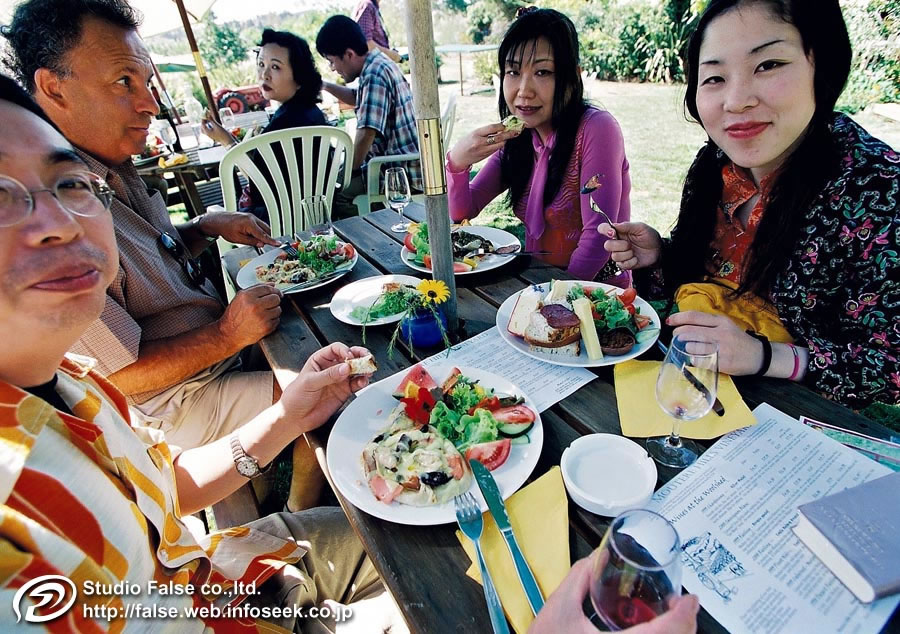 つまみとして頼んだ「チーズとサラダ盛り」や「ピザ」などは普通の値段ですが、えらいボリュームでバカウマ。というわけでこのあたり、酒と食い物写真が続きます。ご勘弁ください。ホントにのどかなネルソンの昼下がり。ぶどう畑の前で記念撮影して、そろそろ次に行きましょう。