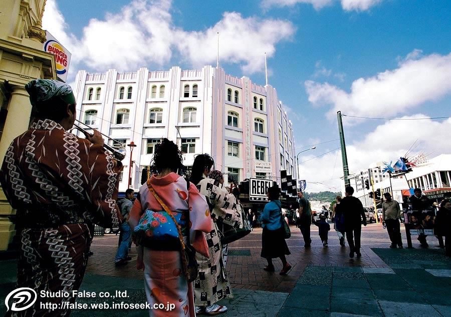 遊んでいても仕方がないので、天候の回復を待って、いよいよチンドンパフォーマンス開始です。実は私たち取材班の日程は、このウエリントンまで。仕事の関係で一足先に帰国しなければならず、このイベントを最後まで撮影できないのです。それだけにこの地で、きっちりパフォーマンスを撮っておきたいところ。