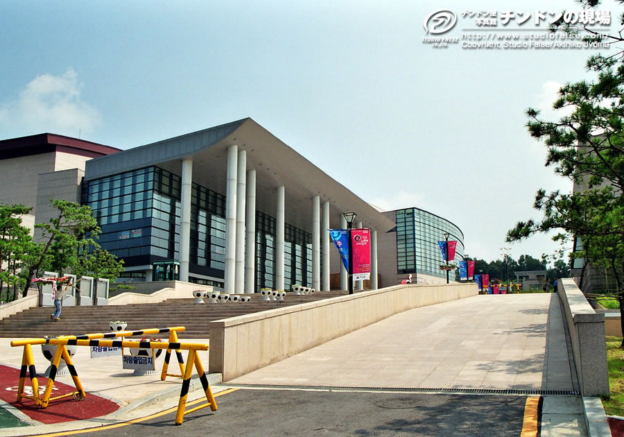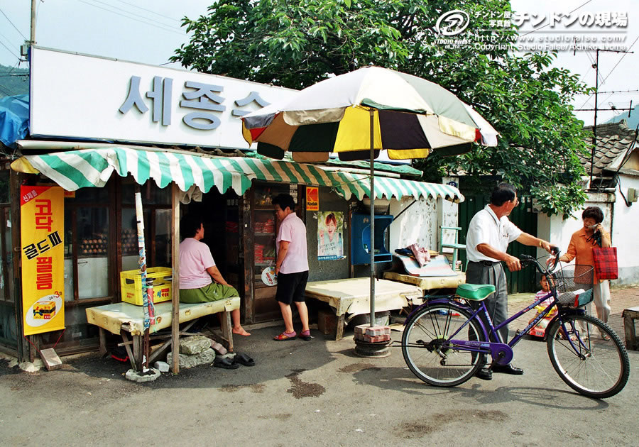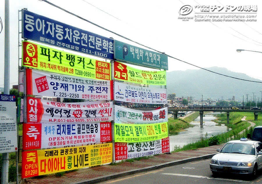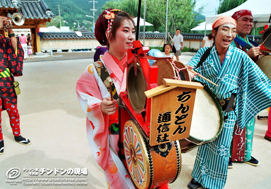2002年8月の終わり、ちんどん通信社の精鋭7名のメンバーが、韓国で音楽祭に出演しました。音楽祭の名前は「全州ソリフェスティバル」。「全州」は「ジョンジュ」と読み、「ソリ」とは「音楽」という意味だそうです。ソウルの空港から迎えのバスで、朝鮮半島のほぼ真ん中にある全州へ向かいます。時刻は夜。ドライブインで食事をすませ、そのまま音楽祭の運営事務局へ。ここで簡単な打ち合わせをしてから、宿舎となる「サムソン」の宿泊施設に送ってもらいます。