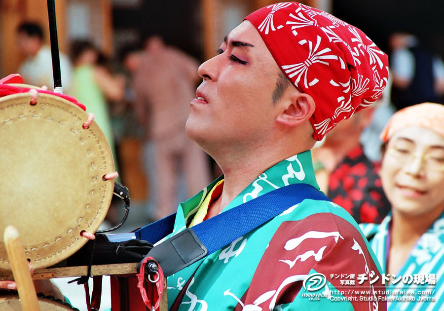 扮装を整えたちんどん通信社メンバー一行は、まずは会場内をひとまわり。適当な空きスペースをみつけて、演奏をはじめます。それにしても毎度のことながら、屋外で、太陽の下でみるチンドン屋さんはとても素晴らしい。ステージの照明に照らされた姿より、何倍も輝いて見えるのは私だけでしょうか?続いて会場の広場に建てられたテントの下で、演奏&パフォーマンス。詰めかけたお客さんも大喜びです。この広場では、他にも学生さんによるサムルノリなどが行われています。こちらも迫力満点!
