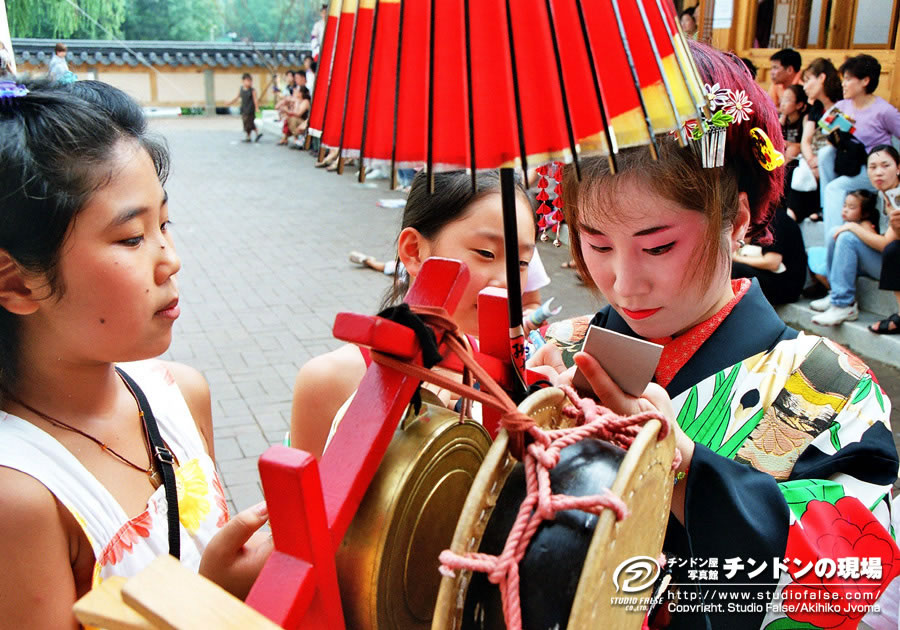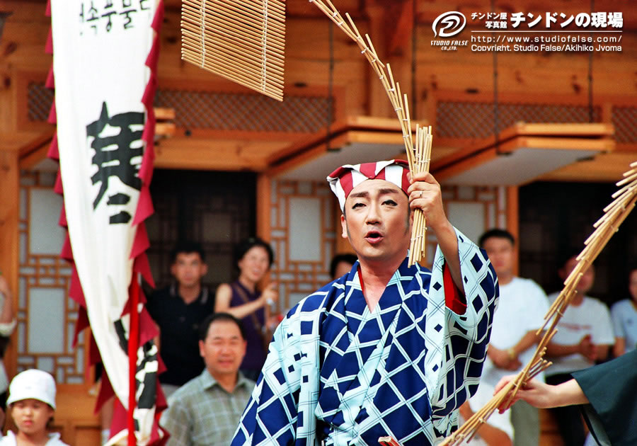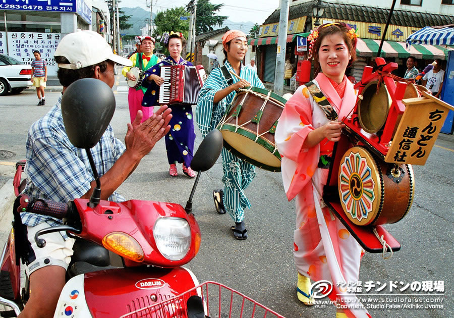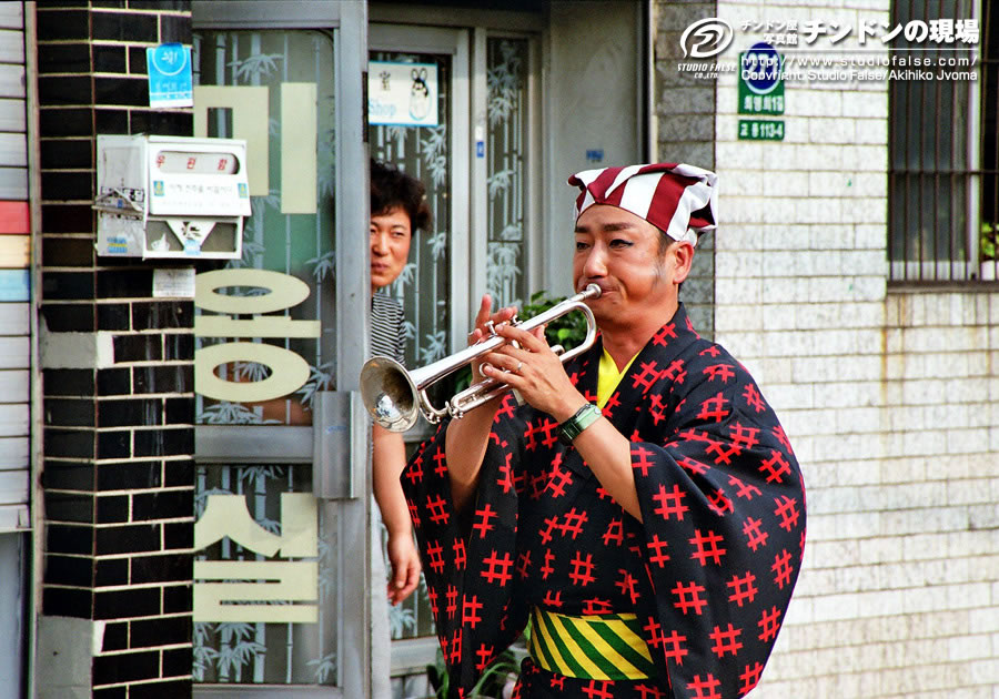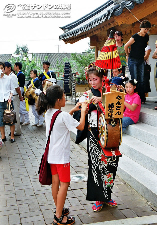 2日目からはさらに観客も増えました。会場のテント下での演奏時に、韓国語で簡単な説明のアナウンスも入るようになりました。主催者側も初めてみる「チンドン屋」ですから、ようやく感じがつかめ、活かし方がわかってきたのでしょう。