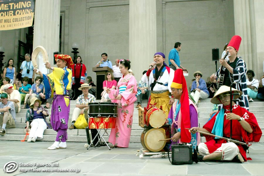 午後から3回目、ラストの出番です。美術館エントランスから芝生の広場にパレード。さらにエントランスにもどって、「秋田音頭」「ささら舞い」を披露します。