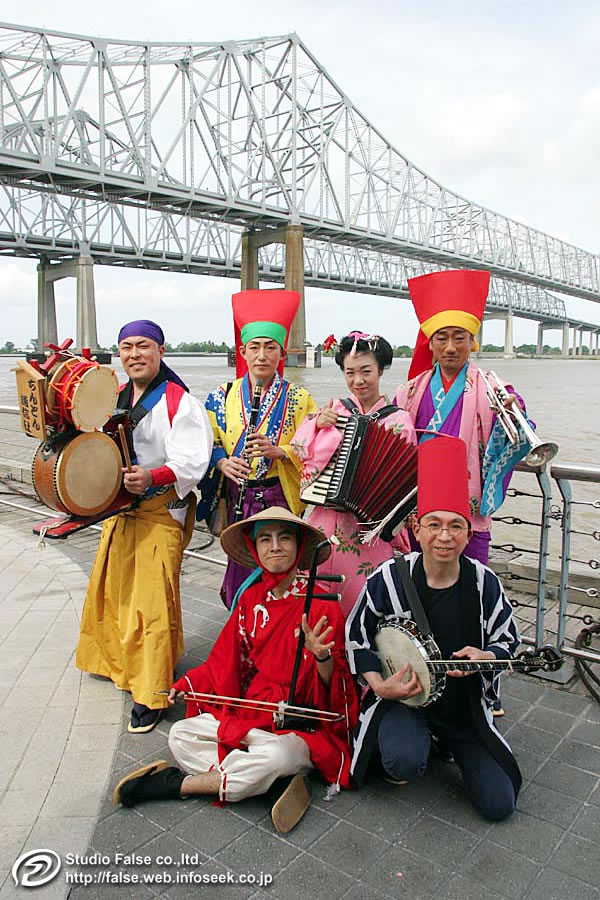 運転手さんにムリをお願いして、グレーターニューオリンズ橋のそば、フェリー乗り場で車を止めてもらいました。扮装し、楽器を持ったままの記念撮影というのは、なかなかに難しいものなんです。有名な観光スポット、写真スポットは人が多いので、そんな場所に彼らが登場すると、たちまち人だかりになってしまいます。運良く桟橋には人はおらず、無事に撮影ができました。ついでにお世話になった運転手さんも一緒にパチリ。